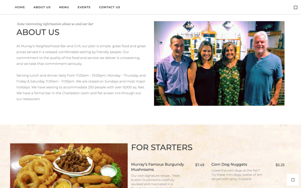 At Murray’s Neighborhood Bar and Grill, our plan is simple: great food and great prices served in a relaxed, comfortable setting by friendly people. Our commitment to the quality of the food and service we deliver is unwavering, and we take that commitment seriously.