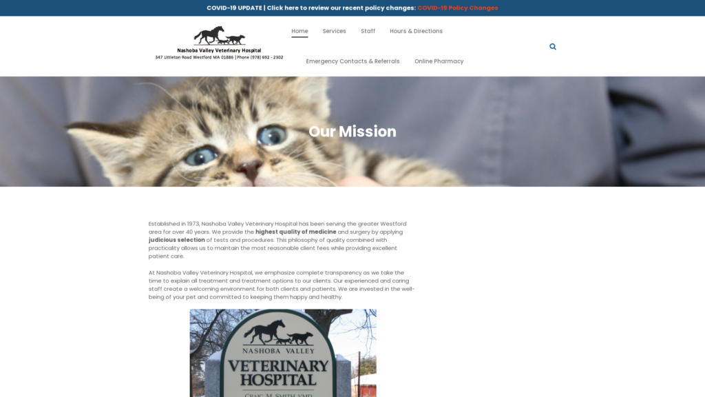 Established in 1973, Nashoba Valley Veterinary Hospital has been serving the greater Westford area for over 40 years. We provide the highest quality of medicine and surgery by applying a judicious selection of tests and procedures. This philosophy of quality combined with practicality allows us to maintain the most reasonable client fees while providing excellent patient care.