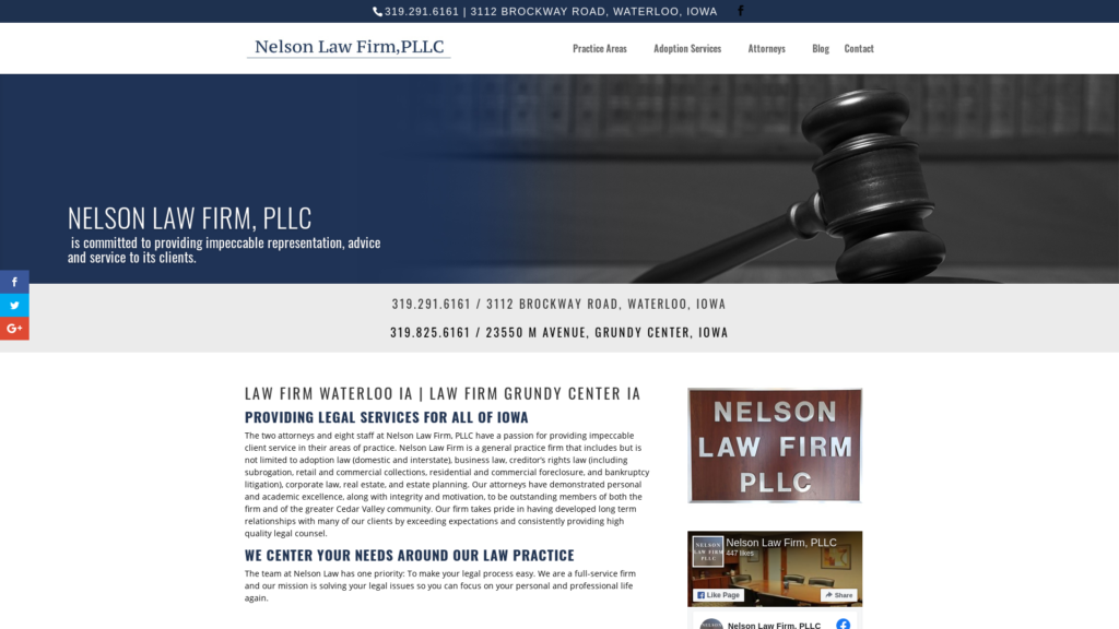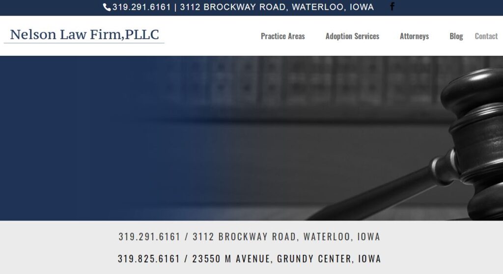 The two attorneys and eight staff at Nelson Law Firm, PLLC have a passion for providing impeccable client service in their areas of practice. Nelson Law Firm is a general practice firm that includes but is not limited to adoption law (domestic and interstate), business law, creditor’s rights law (including subrogation, retail and commercial collections, residential and commercial foreclosure, and bankruptcy litigation), corporate law, real estate, and estate planning. Our attorneys have demonstrated personal and academic excellence, along with integrity and motivation, to be outstanding members of both the firm and of the greater Cedar Valley community. Our firm takes pride in having developed long-term relationships with many of our clients by exceeding expectations and consistently providing high-quality legal counsel.