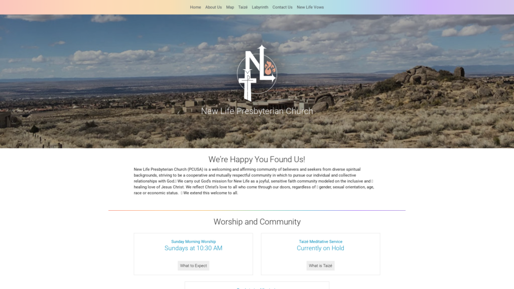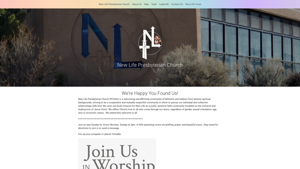 New Life Presbyterian Church (PCUSA) is a welcoming and affirming community of believers and seekers from diverse spiritual backgrounds, striving to be a cooperative and mutually respectful community in which to pursue our individual and collective relationships with God. We carry out God’s mission for New Life as a joyful, sensitive faith community modeled on the inclusive and healing love of Jesus Christ. We reflect Christ’s love to all who come through our doors, regardless of gender, sexual orientation, age, race or economic status. We extend this welcome to all.