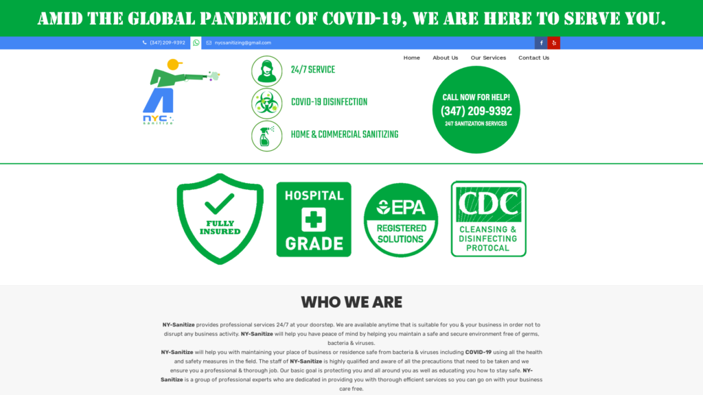 New York Sanitize Serving You , Saving You (24/7) . New York Sanitize is working hard to help you maintain a safe and secure lifestyle without fearing of germs and bacteria. Give us a call : (347) 209-9392