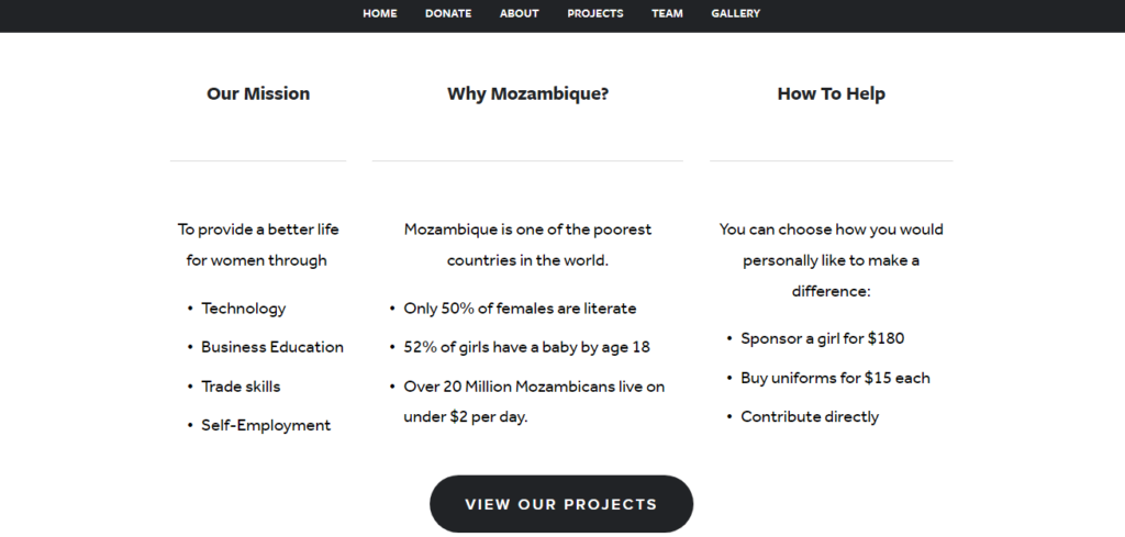 Our mission is to help the women and girls of Mozambique; we want to give them an opportunity to become educated and develop job skills so they too have a chance to create no poor among them.