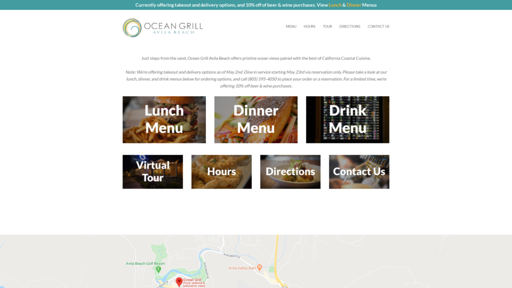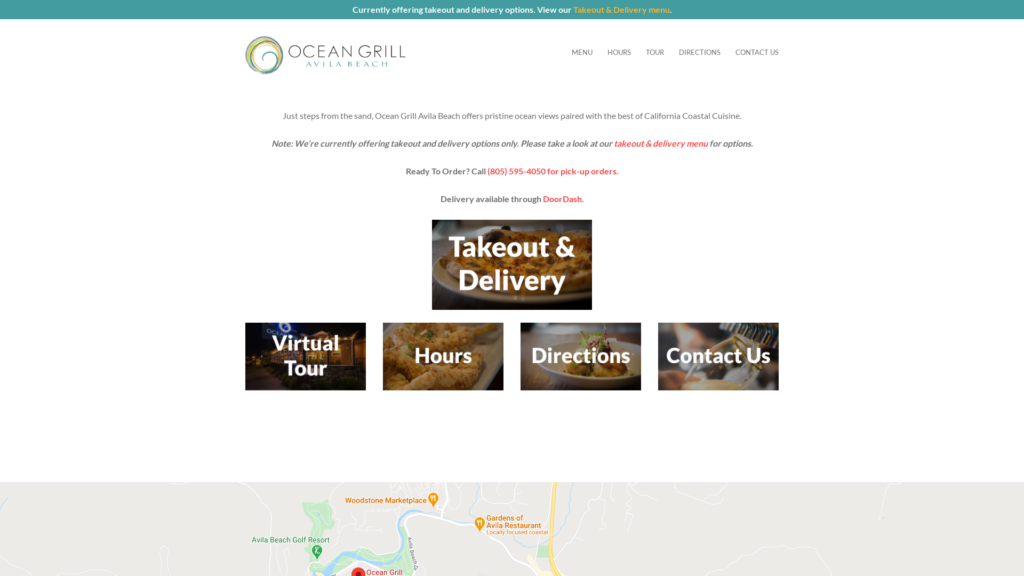 Just steps from the sand, Ocean Grill Avila Beach offers pristine ocean views paired with the best of California Coastal Cuisine. Note: We’re currently offering takeout and delivery options only. Please take a look at our takeout & delivery menu for options. Ready To Order? Call (805) 595-4050 for pick-up orders. D