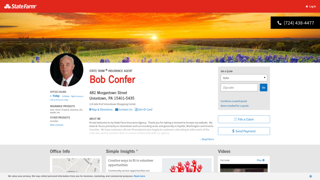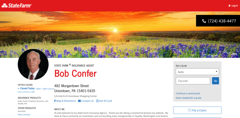We provide “FREE” quotes for auto insurance, home insurance, life insurance, and health insurance. I have been in the insurance industry since 1969 and came to State Farm in September of 1974. My office has been in Uniontown for the past 46 years and is currently located at 482 Morgantown Street. We have a spacious free parking lot at the rear of the building where the main entrance is located.
