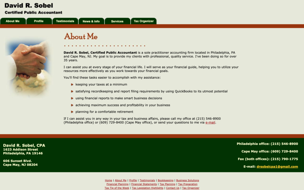 David R. Sobel, Certified Public Accountant is a sole practitioner accounting firm located in Philadelphia, PA and Cape May, NJ. My goal is to provide my clients with professional, quality service. I’ve been doing so for over 35 years.