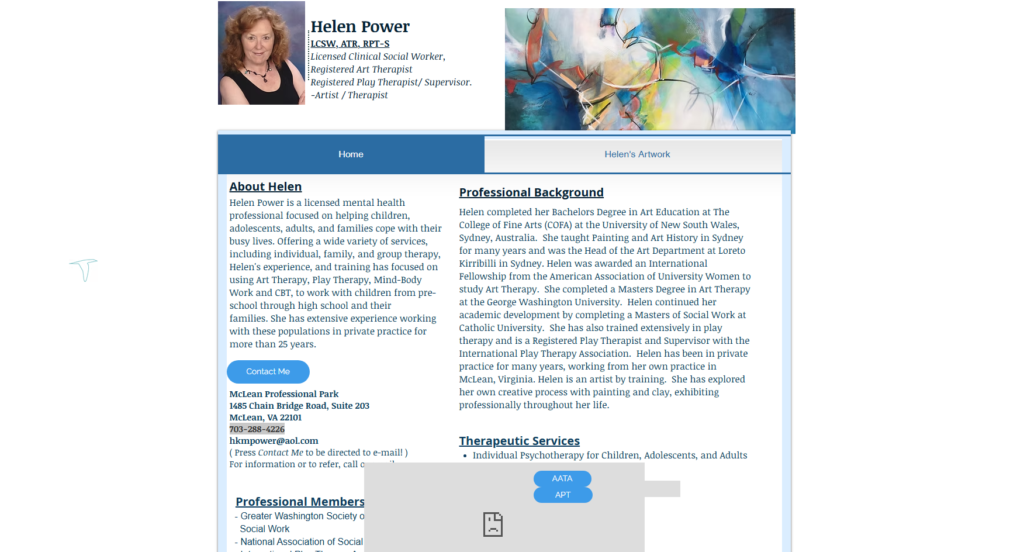 Helen Power is a licensed mental health professional focused on helping children, adolescents, adults, and families cope with their busy lives. Offering a wide variety of services, including individual, family, and group therapy, Helen’s experience, and training has focused on using Art Therapy, Play Therapy, Mind-Body Work and CBT, to work with children from pre-school through high school and their families. She has extensive experience working with these populations in private practice for more than 25 years.