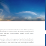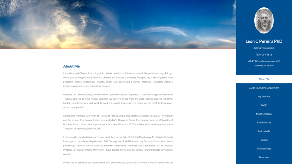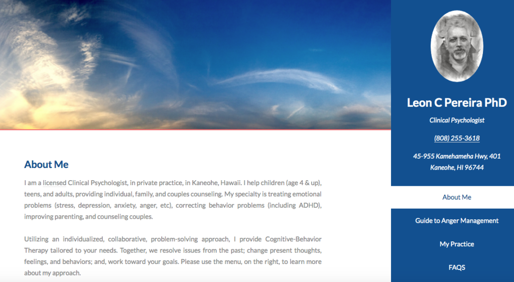 I am a licensed Clinical Psychologist, in private practice, in Kaneohe, Hawaii. I help children (age 4 & up), teens, and adults, providing individual, family, and couples counseling. My specialty is treating emotional problems (stress, depression, anxiety, anger, etc), correcting behavior problems (including ADHD), improving parenting, and counseling couples.