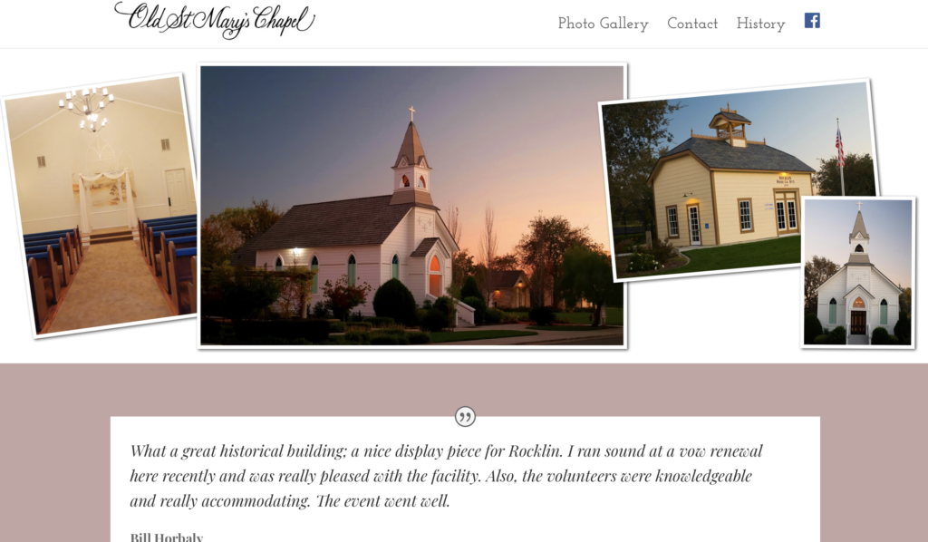 Attached to the chapel is an annex room with a large bathroom perfect for getting ready for the special event. Leaving the annex by the side door you follow the path back to the front of the chapel for a grand entrance! The 135-year-old historic building is located in old downtown Rocklin where it is conveniently located near various reception and rehearsal dinner sites.