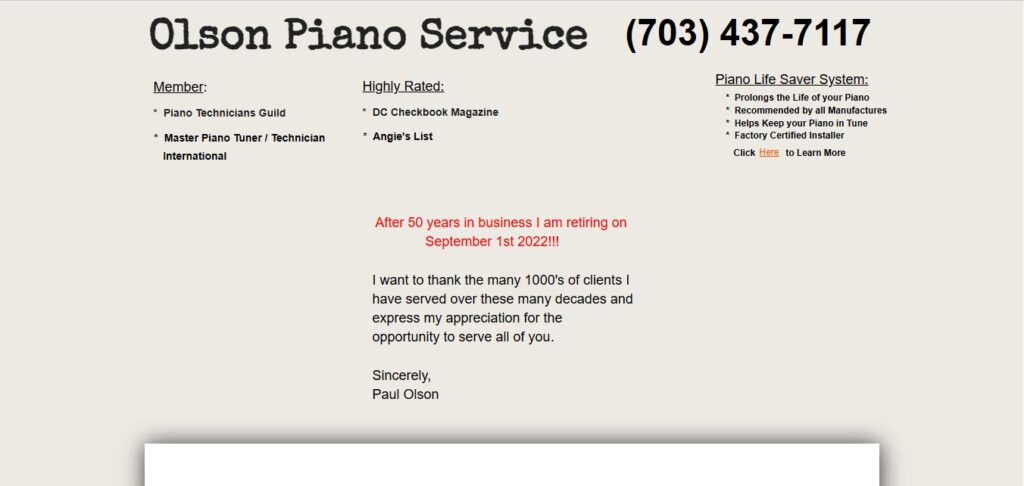 Olson Piano Service was founded in 1973 by Paul Olson. With close to 50 years of experience, I have serviced over 85,000 clients in the Northern Virginia and other surrounding Washington suburbs, including over 70,000 tunings.