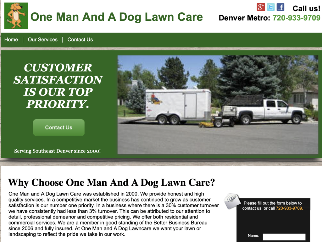 One Man and A Dog Lawn Care was established in 2000. We provide honest and high quality services. In a competitive market the business has continued to grow as customer satisfaction is our number one priority. In a business where there is a 30% customer turnover we have consistently had less than 3% turnover. This can be attributed to our attention to detail, professional demeanor and competitive pricing. We offer both residential and commercial services. We are a member in good standing of the Better Business Bureau since 2006 and fully insured. At One Man and A Dog Lawncare we want your lawn or landscaping to reflect the pride we take in our work