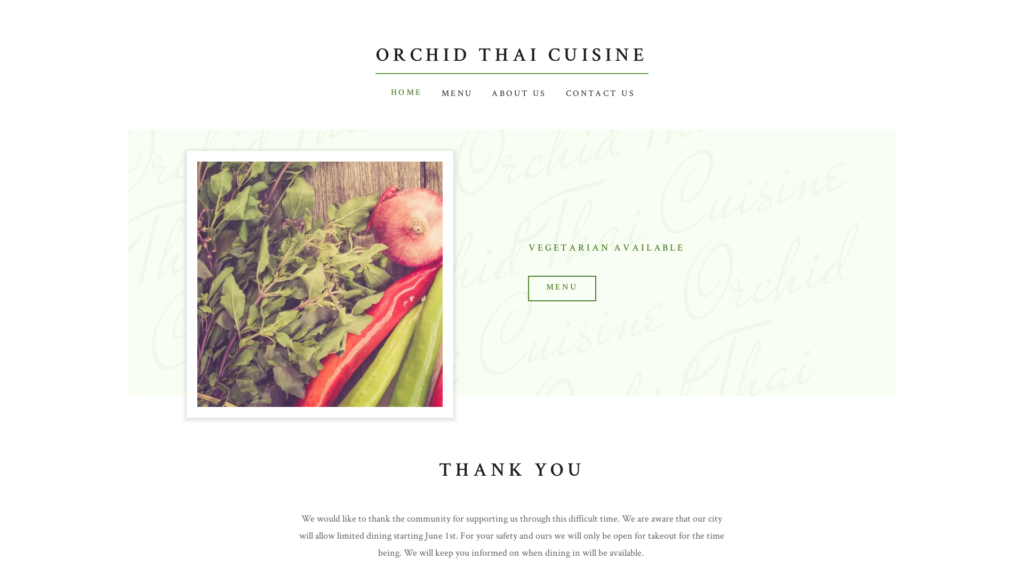 Orchid Thai Cuisine is our family restaurant. We have worked really hard for you, please enjoy your experience with us. We make everything fresh to order. We take our time to prepare each dish making sure it comes out right. Our restaurant has a small kitchen, but we never skimp on the quality of food we serve you. Welcome to our bit of Thailand. Enjoy your visit with us.