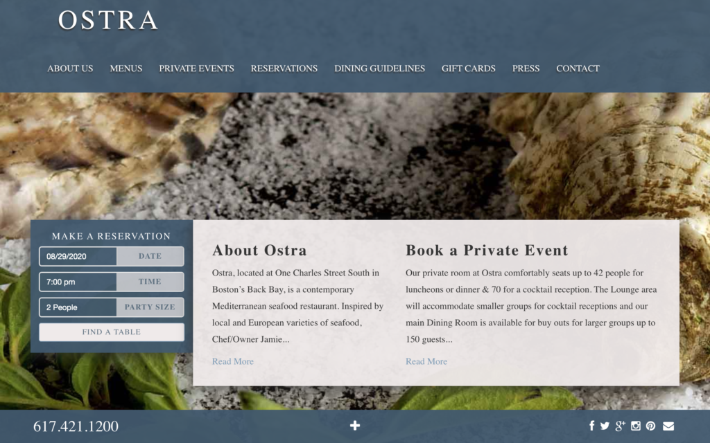 Ostra, located at One Charles Street South in Boston’s Back Bay, is a contemporary Mediterranean restaurant. Inspired by local and European varieties of seafood, Chef/Owner Jamie Mammano and Executive Chef Mitchell Randall focus on specialty seafood found throughout the Mediterranean and regions within the U.S. The light preparation of our cuisine highlights the natural and fresh flavors of each dish. The dining room at Ostra evokes a sense of style and sophistication in a comfortable and inviting setting. Ostra also offers a fine bar and lounge area featuring live piano entertainment. Ostra’s private dining room accommodates up to 42 for a seated event and up to 70 for a cocktail reception.