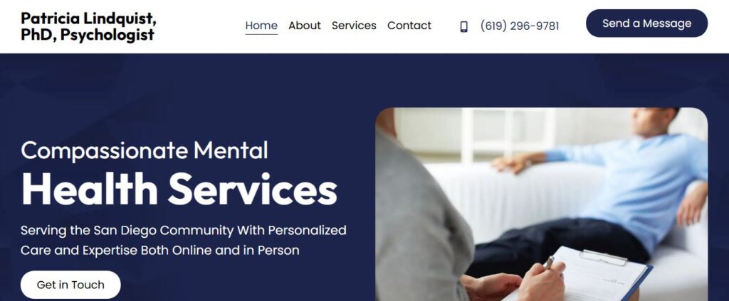 PATRICIA (DR PAT) LINDQUIST earned a PhD in Clinical Psychology from Alliant-USIU University in San Diego, California. She received post-doctoral training in Relationship Therapies at the Freud Center, London, and the Washington, DC School of Psychiatry. She has been approved by the British Association of Psychodynamic Psychotherapy to use Mentalization Based Treatment for individuals who have suffered long term anxiety with social and interpersonal relationships. Dr Pat is active in the Christian Community of San Diego. She practices Telehealth for those persons in California who cannot do in person sessions. She is a member of the San Diego Psychological Association, California Psychological Association, and American Psychological Association. She was selected as a Top Psychologist in San Diego by the International Association of HealthCare Professionals (IAHCP).