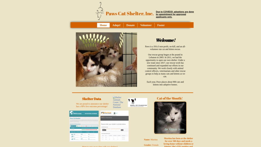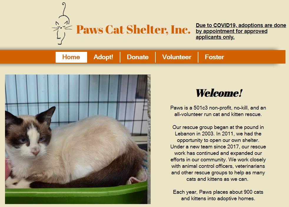 Our rescue group began at the pound in Lebanon in 2003. In 2011, we had the opportunity to open our own shelter. Under a new team since 2017, our rescue work has continued and expanded our efforts in our community. We work closely with animal control officers, veterinarians, and other rescue groups to help as many cats and kittens as we can. Each year, Paws places about 900 cats and kittens into adoptive homes.
