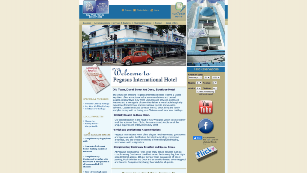 The 100% nonsmoking Pegasus International Hotel Rooms & Suites – Key West offers exceptional value accommodations and central location in Downtown, Key West. Unsurpassed services, enhanced features and a menagerie of amenities deliver a remarkable hospitality experience for both local and international tourists and vacation travelers. Located on Duval Street at the 500 blocks. Bring the family and plan to stay with us during your Christmas and New Year Holidays.