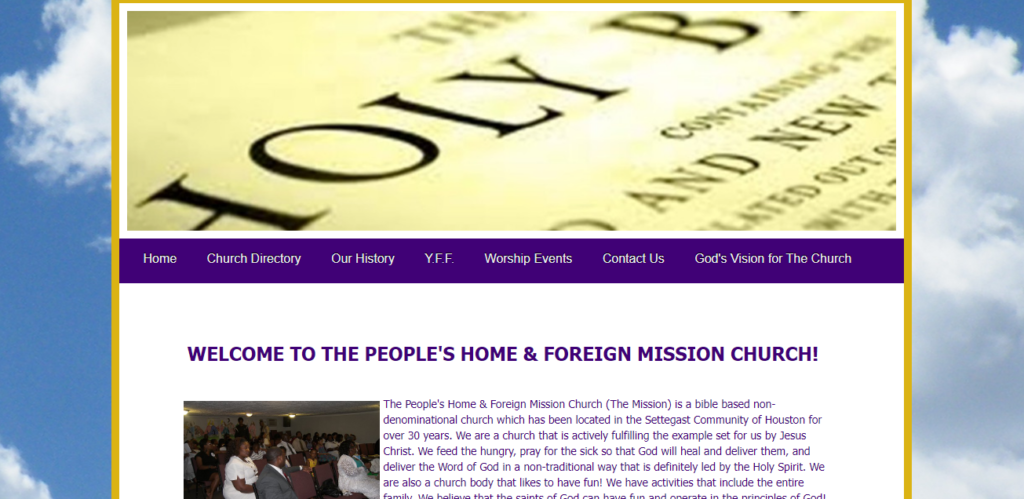 The People’s Home & Foreign Mission Church (The Mission) is a bible based non-denominational church which has been located in the Settegast Community of Houston for over 30 years. We are a church that is actively fulfilling the example set for us by Jesus Christ. We feed the hungry, pray for the sick so that God will heal and deliver them, and deliver the Word of God in a non-traditional way that is definitely led by the Holy Spirit. We are also a church body that likes to have fun! We have activities that include the entire family. We believe that the saints of God can have fun and operate in the principles of God!