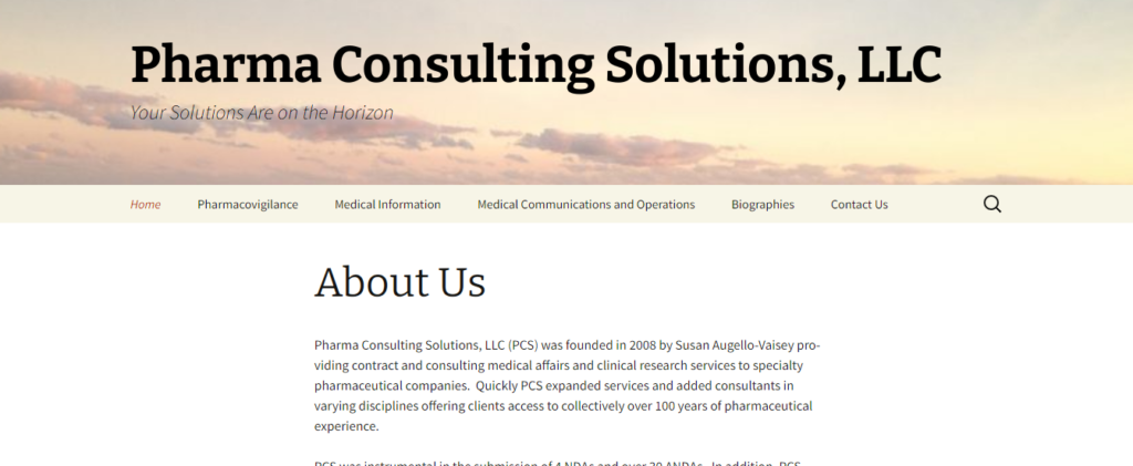 Pharma Consulting Solutions, LLC (PCS) was founded in 2008 by Susan Augello-Vaisey providing contract and consulting medical affairs and clinical research services to specialty pharmaceutical companies. Quickly PCS expanded services and added consultants in varying disciplines offering clients access to collectively over 100 years of pharmaceutical experience.