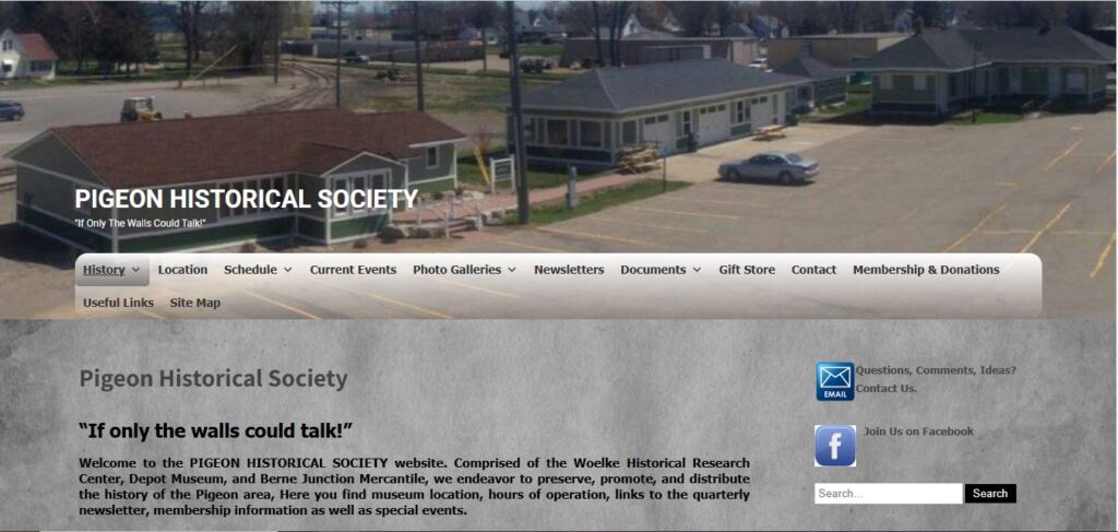 Welcome to the PIGEON HISTORICAL SOCIETY website. Comprised of the Woelke Historical Research Center, Depot Museum, and Berne Junction Mercantile, we endeavor the preserve, promote, and distribute the history of the Pigeon area, Here you find museum location, hours of operation, links to the quarterly newsletter, membership information as well as special events.