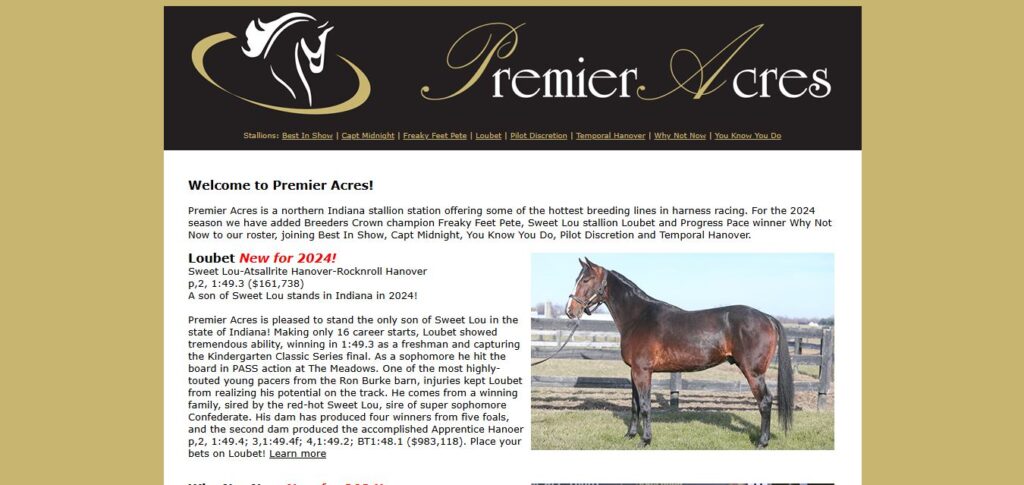Premier Acres is a northern Indiana stallion station offering some of the hottest breeding lines in harness racing. For the 2024 season we have added Breeders Crown champion Freaky Feet Pete, Sweet Lou stallion Loubet and Progress Pace winner Why Not Now to our roster, joining Best In Show, Capt Midnight, You Know You Do, Pilot Discretion and Temporal Hanover.
