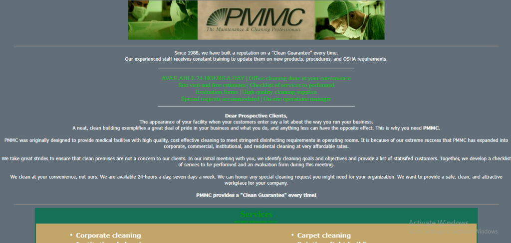 PMMC was originally designed to provide medical facilites with high quality, cost effective cleaning to meet stringent disinfecting requirements in operating rooms. It is because of our extreme success that PMMC has expanded into corporate, commercial, institutional, and residental cleaning at very affordable rates.