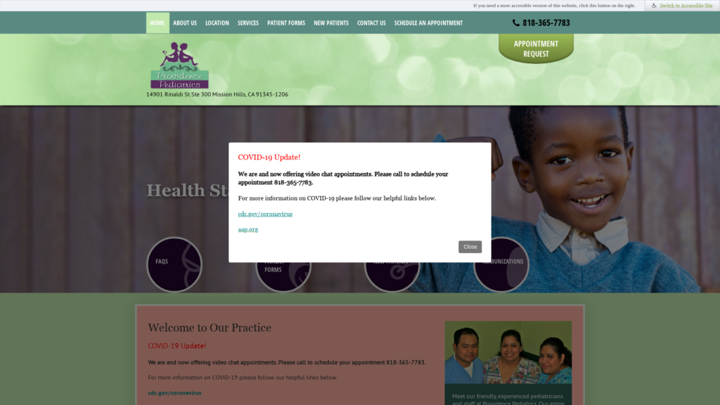 Please take a few moments to explore our informational website. We hope you will find our site easy to navigate, informative, and helpful in keeping your family healthy. This website gives you easy access to our Mission Hills pediatric practice, including directions, hours of operations, payment policies, information about our physicians and our services, and even a link to request an appointment. It also includes answers to some of our most commonly asked questions.