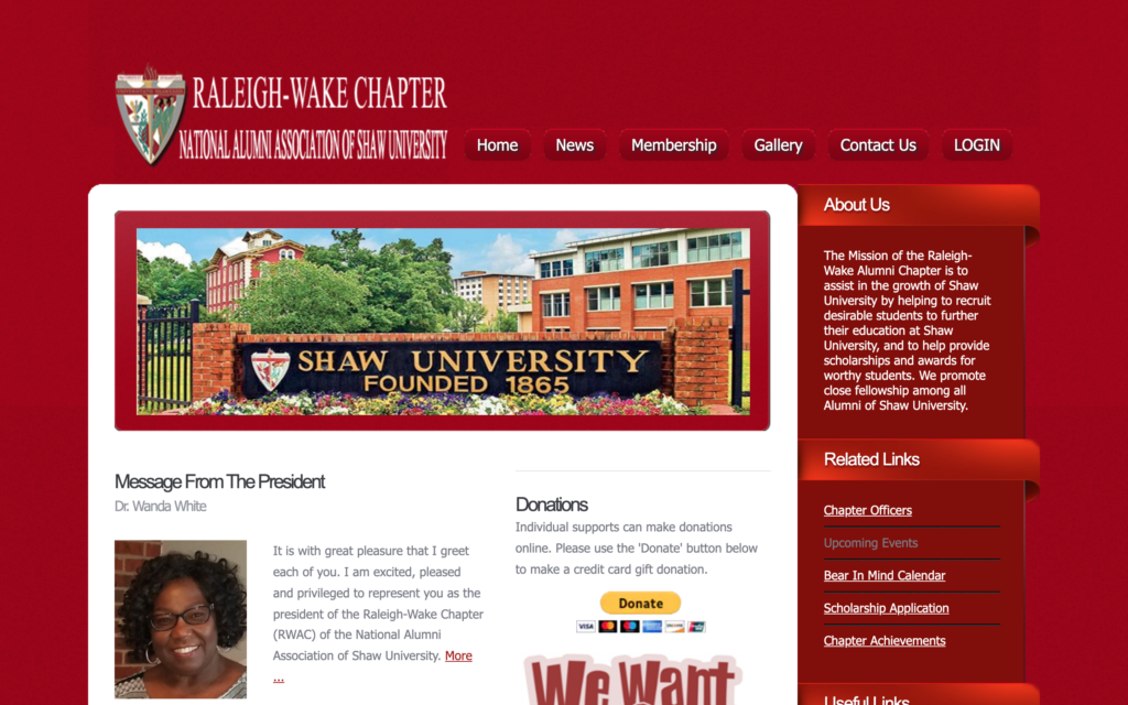 The Mission of the Raleigh-Wake Alumni Chapter is to assist in the growth of Shaw University by helping to recruit desirable students to further their education at Shaw University and to help provide scholarships and awards for worthy students. We promote close fellowship among all Alumni of Shaw University.