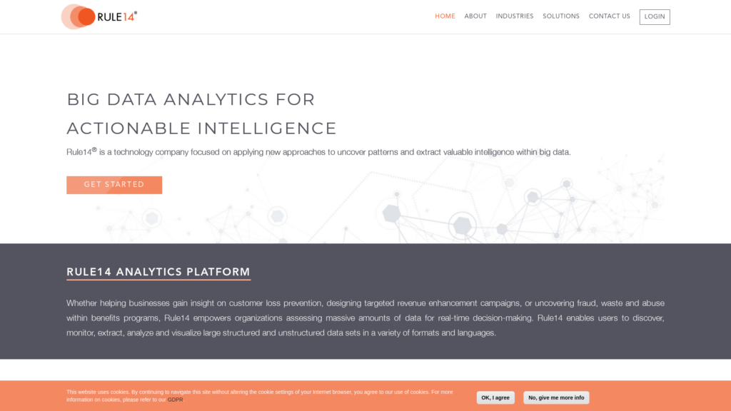 Rule14 is a data-mining company that offers a suite of solutions and services powered by predictive analytics. From forecasting electric load across millions of smart meters for energy traders to creating automated summaries for legal content aggregators, Rule14 offers industry-agnostic insights via a big data-enabled automation.The Rule14 solution begins with two elements: the digital record and an objective. Whether it is a financial transaction and loan prediction, a call center record and churn prediction, or free-from textual documents and a unique classification – once the base unit and objective functions are defined, our global team of elite data scientists are able to process unstructured data into structured data to rapidly deliver customized data-driven insights in a quick turnaround time.
