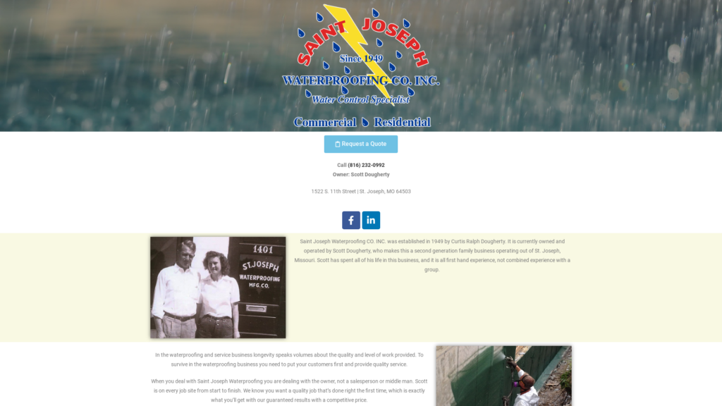Saint Joseph Waterproofing CO. INC. was established in 1949 by Curtis Ralph Dougherty. It is currently owned and operated by Scott Dougherty, who makes this a second generation family business operating out of St. Joseph, Missouri. Scott has spent all of his life in this business, and it is all first-hand experience, not combined experience with a group.