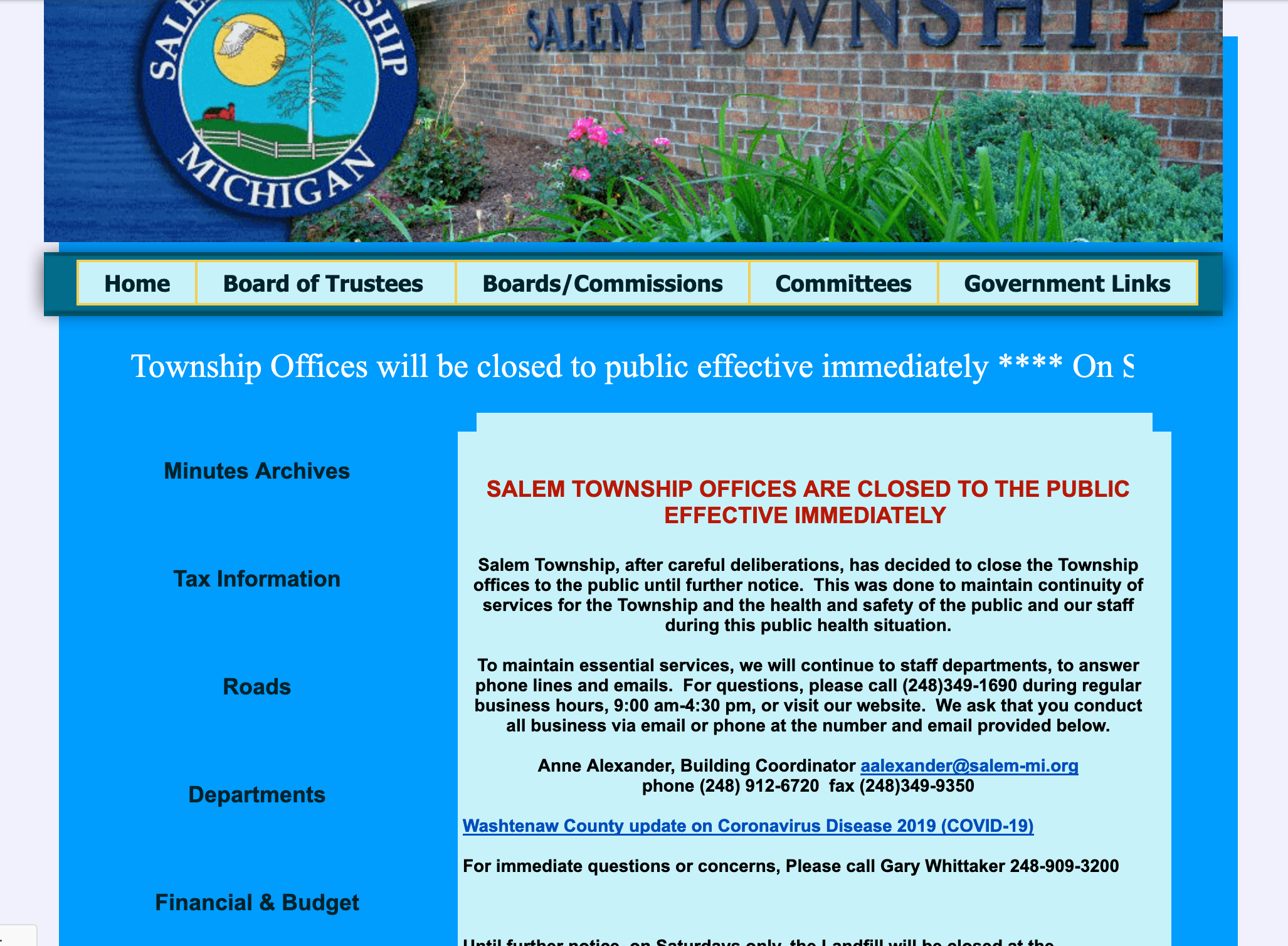 Salem Township, after careful deliberations, has decided to close the Township offices to the public until further notice. This was done to maintain continuity of services for the Township and the health and safety of the public and our staff during this public health situation.