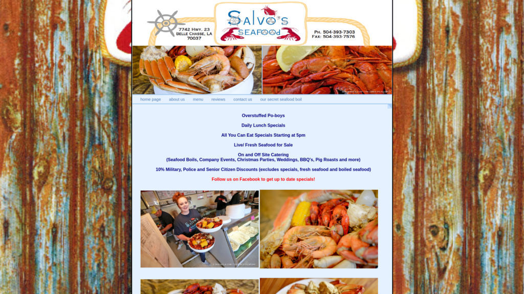 Salvo’s Seafood has been a family-owned restaurant since 1984. From the very beginning, we have focused on consistently providing our customers with quality, quantity, and low prices. We offer a wide array of items varying from boiled & fried seafood to steaks and ribs. Take a look at our menus to see all that we have to offer. If you cannot visit us at 7742 Hwy 23 in Belle Chasse, then we can visit you. We have a truck and trailer equipped with everything we need to throw the perfect crawfish (or any other seafood) boil for you and your guests. If seafood isn’t exactly what you had in mind for your event, then we can come up with a menu to suit your needs. We have cooked brisket, oyster dressing, whole turkeys, and many other specialty items for our customers. So let us cater your next event, you won’t be disappointed. We can cater on and off-site, as well as ship seafood to you. For more information give us a call at (504) 393-7303.