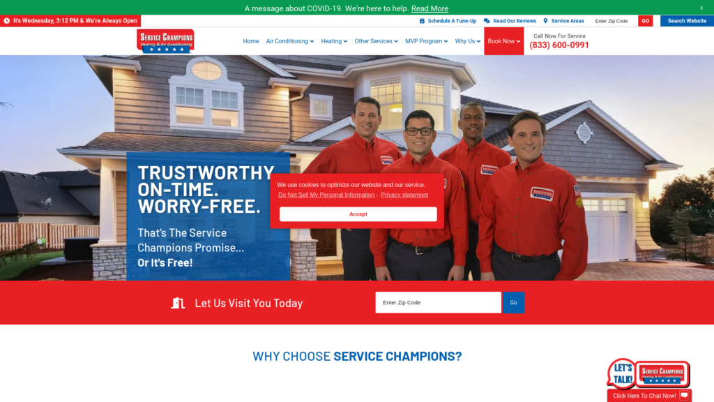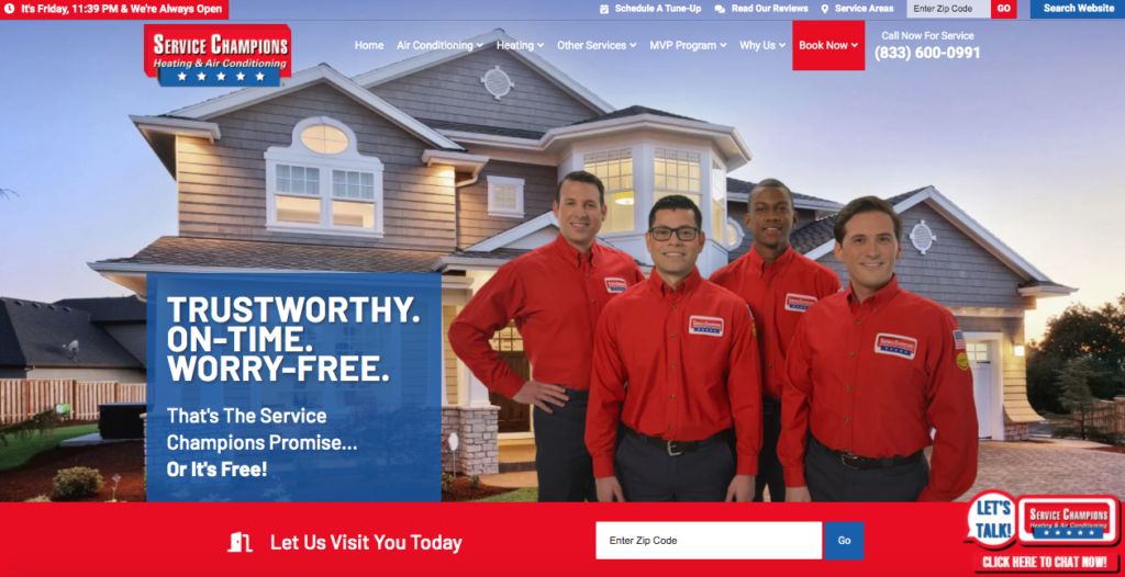 At Service Champions, we have assembled a team of professionals with one goal in mind, your complete and total satisfaction. From air conditioning and heating tune-ups, maintenance, repairs, installations and plumbing our Peace of Mind Guarantees is our written commitment to you. For your security, all of our staff are background checked and drug tested and we’ll email a picture of our technician before he arrives. We have a state-of-the-art training facility where each technician receives 150 hours of mandatory classroom training each year. From the moment you contact our call center, to the technician completing the job and leaving your home, you’ll then understand why our name is Service Champions.