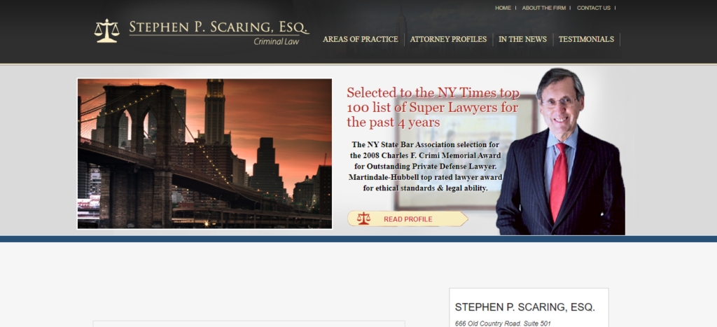 Stephen P. Scaring is a prominent and well-respected trial lawyer in the metropolitan area, who maintains offices in Garden City and Manhattan. He has been selected to the New York Times Top 100 list of Super Lawyers for the past four years, and was the recipient of the New York State Bar Association’s prestigious Charles F. Crimi Memorial Award for outstanding criminal defense practice in 2008. He is a fellow of the American College of Trial Lawyers and a member of the New York Council of Criminal Defense Lawyers. He maintains a boutique practice focusing on criminal defense and white collar criminal defense.
