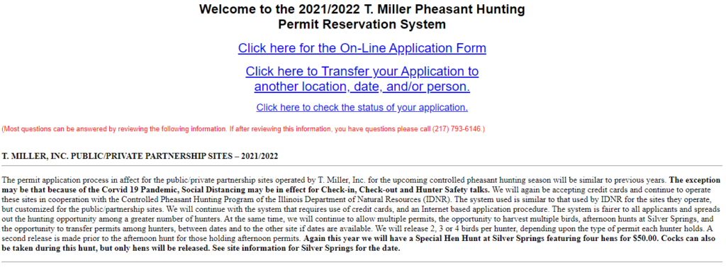 The permit application process in affect for the public/private partnership sites operated by T. Miller, Inc. for the upcoming controlled pheasant hunting season will be similar to previous years.