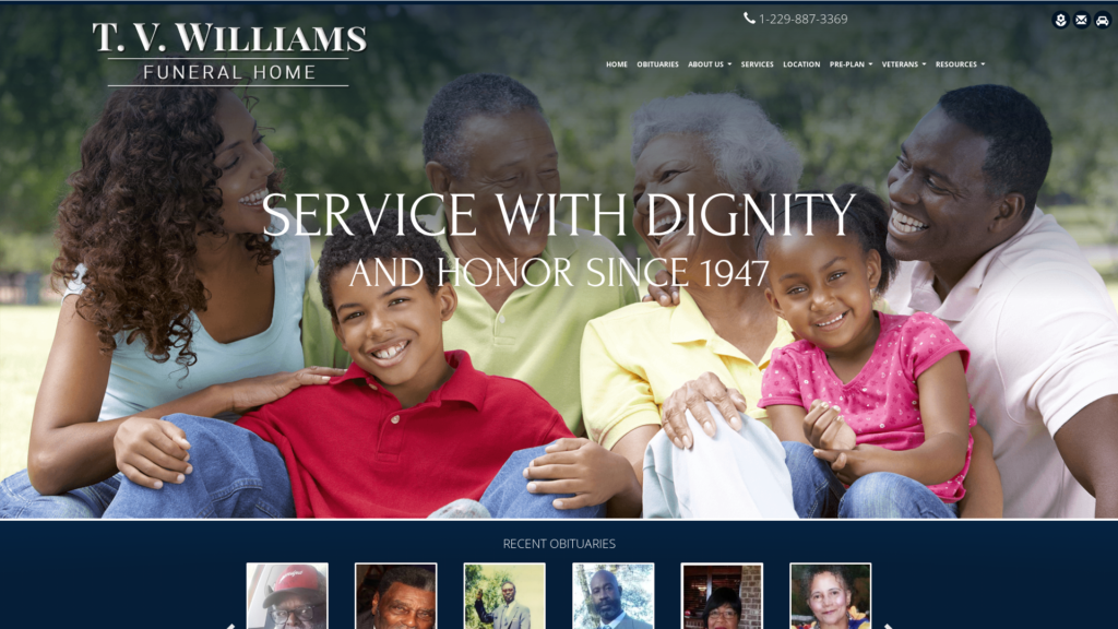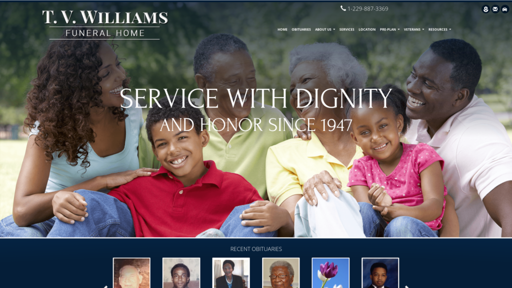 T.V. Williams Funeral Home, located at 505 Milliken Avenue in Richland, (Southwest) Georgia, was purchased by Jacob Cornelius Williams in October 1947. Mr. Williams’ son, Theodore Vernon Williams, operated the funeral home with dignity and honor for many years.