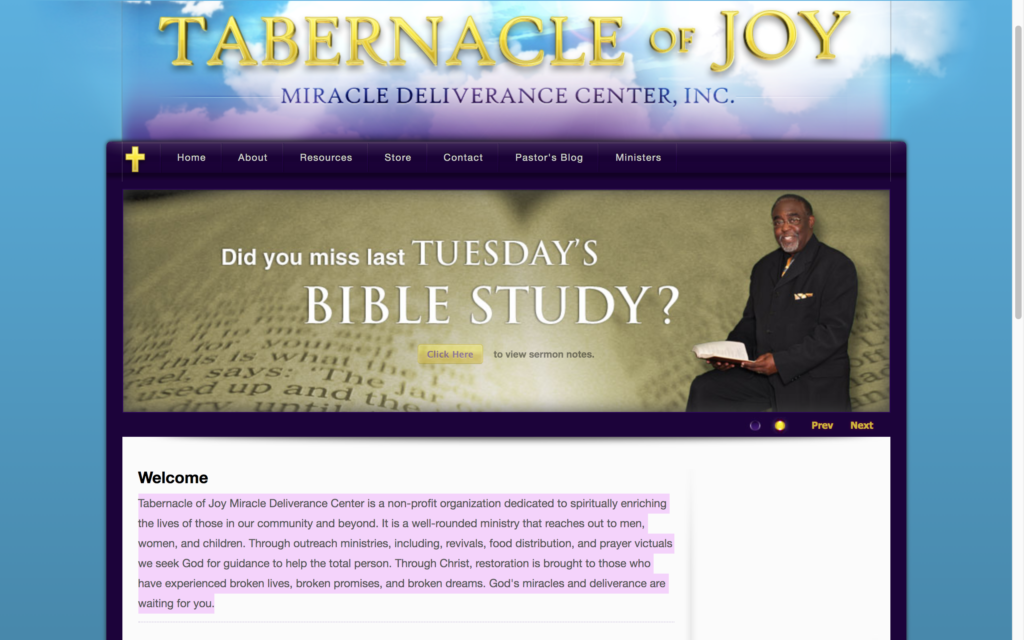 Tabernacle of Joy Miracle & Deliverance Center is a non-profit organization dedicated to spiritually enriching the lives of those in our community and beyond.