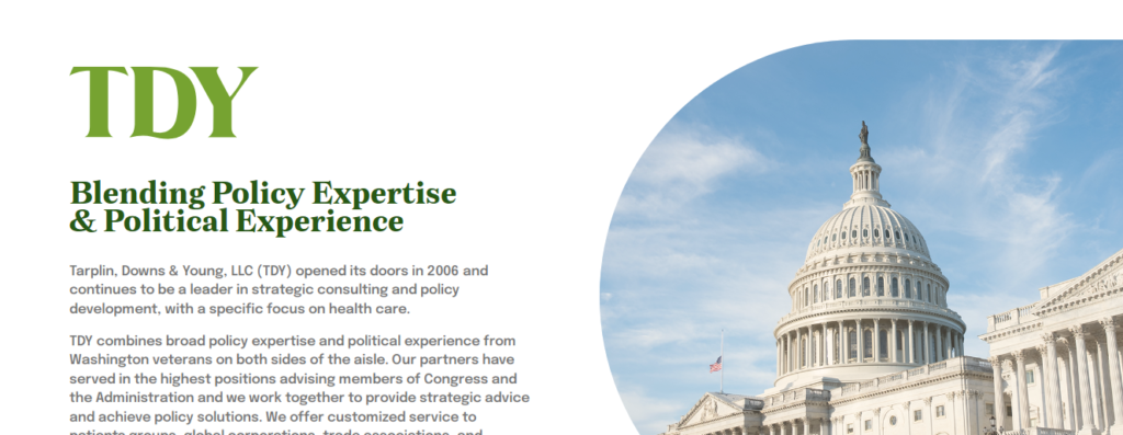 TDY combines broad policy expertise and political experience from Washington veterans on both sides of the aisle. Our partners have served in the highest positions advising members of Congress and the Administration and we work together to provide strategic advice and achieve policy solutions. We offer customized service to patients groups, global corporations, trade associations, and provider organizations on legislative and regulatory priorities.