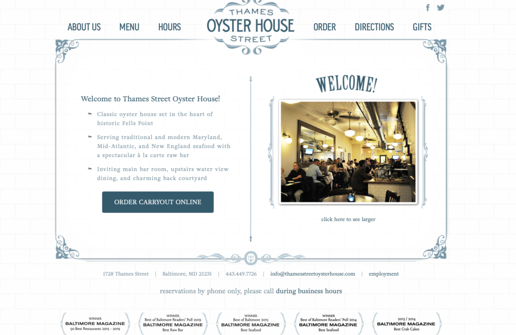 Thames Street Oyster House is a classic raw bar and restaurant serving traditional and modern Maryland, New England, and Mid-Atlantic seafood. Join us in the inviting main bar area, upstairs water view dining room, or spectacular back courtyard.