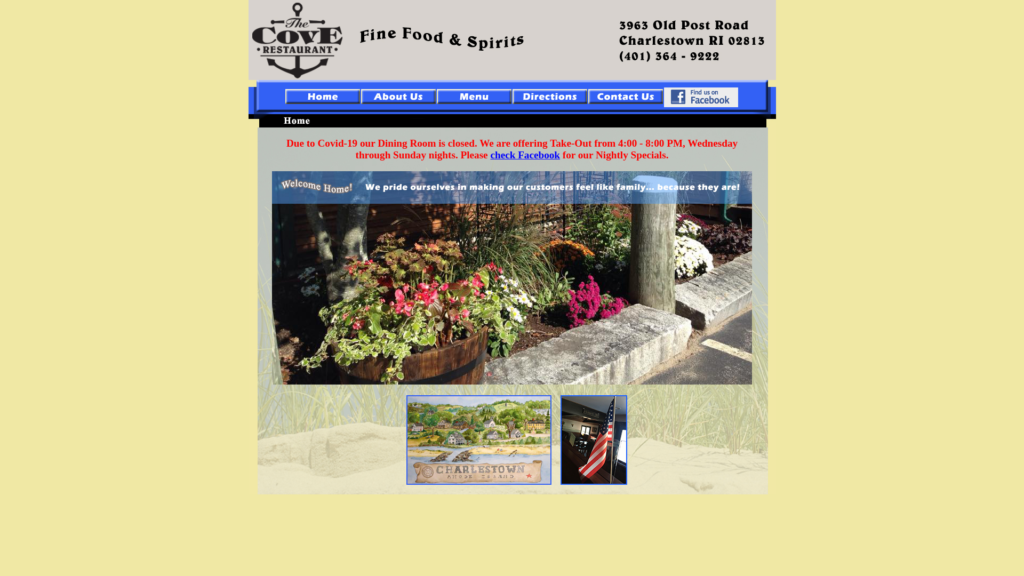 Located on the main strip in Charlestown, The Cove has been serving its loyal clientele since October 4th, 2000. Our family-run establishment has become a staple in the tiny Southern Rhode Island town by the sea. Whether you are in search of a good home-cooked meal or some great conversation, our restaurant has been proud of remembering our customers and making everyone feel welcome since the day we opened the doors.