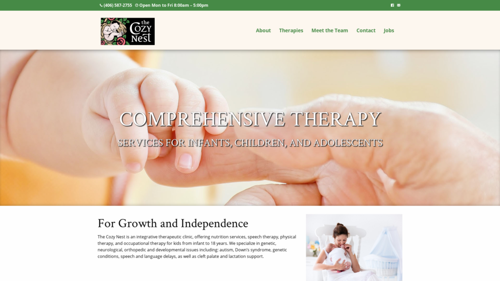 The Cozy Nest is an integrative therapeutic clinic, offering nutrition services, speech therapy, physical therapy, and occupational therapy for kids from infant to 18 years. We specialize in genetic, neurological, orthopedic, and developmental issues including autism, Down’s syndrome, genetic conditions, speech and language delays, as well as cleft palate and lactation support.