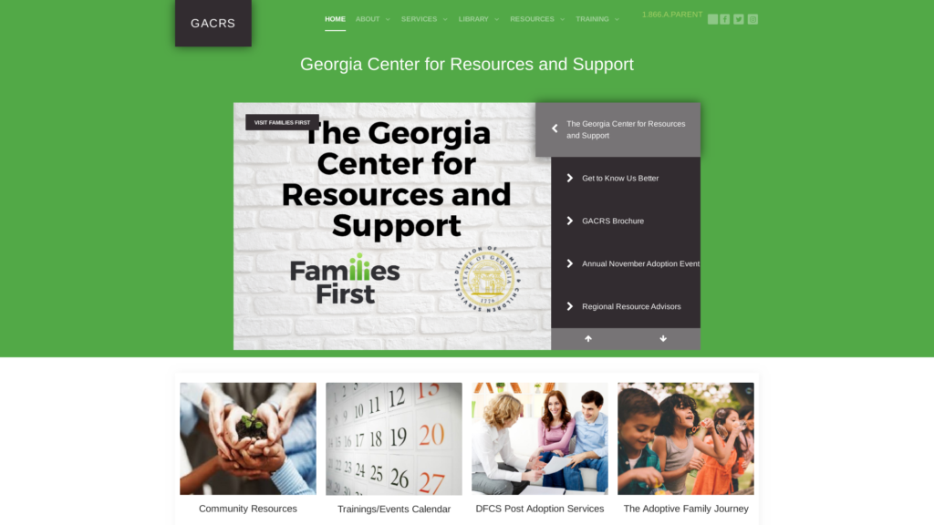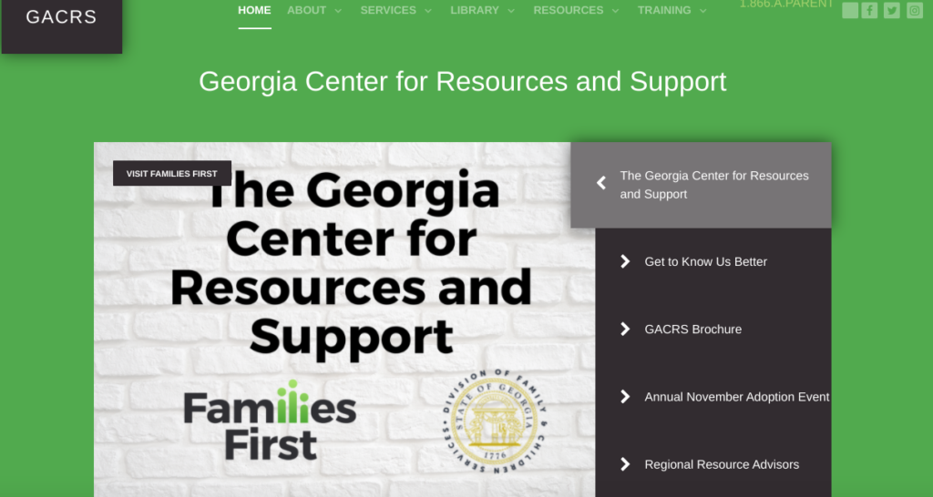 The Georgia Center for Resources and Support (GACRS) was designed in 2001 by the Georgia Division of Family and Children Services to assist in strengthening Georgia’s adoptive and foster families. It is managed by Families First that for the last 130 years, has provided empowering solutions for Atlanta’s most vulnerable population by strengthening and sustaining families. In 1890, Families First started as an orphanage on the westside of Atlanta and in 1937 became the first licensed adoption agency in the state of Georgia.