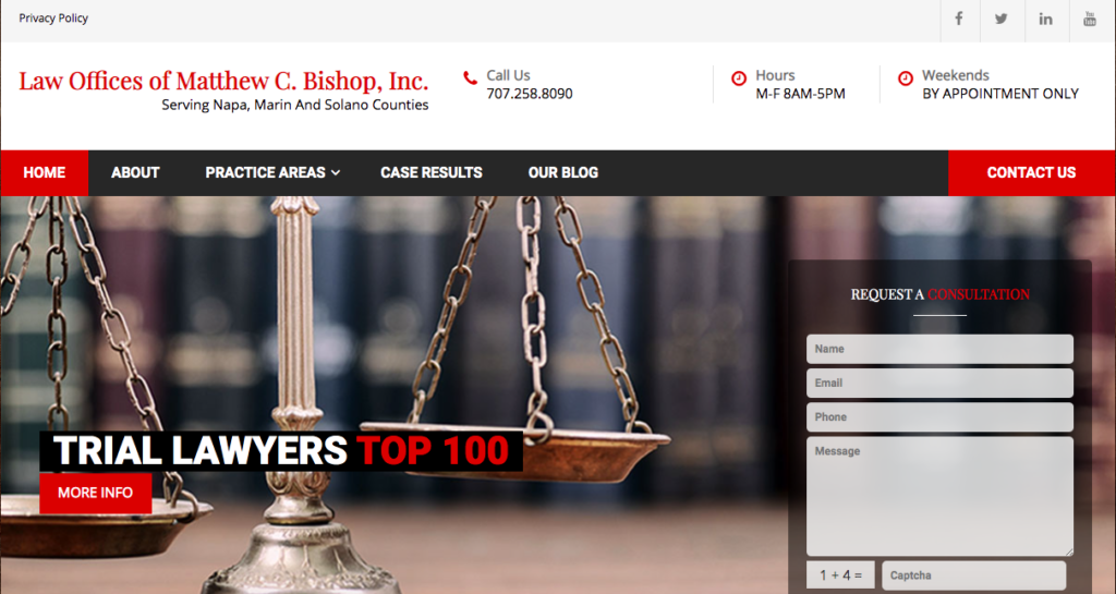 Matthew C. Bishop is a Napa attorney. Matt likes to say his family was in the Napa Valley when “Mon-dah-vi” was pronounced “Mon-day-vi.” The Law Offices of Matthew C. Bishop, Inc., is a real Napa law firm devoted to helping individuals facing serious civil issues and criminal prosecution get justice.
