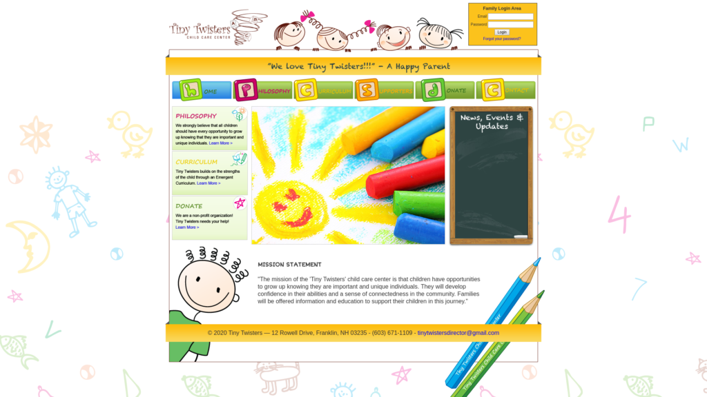 It is the philosophy of Tiny Twisters Child Care Center that children need to be treated as individuals, and to feel safe and secure. We strive to provide our children with opportunities for learning through play, interacting with others, and being involved and engaged in the process of how they are growing.We believe that children learn best through meaningful play. Our play-based, child centered learning and development program reflects the integration of physical, cognitive, social, emotional and language areas for the development of the whole child. Meaningful play encourages curiosity, discovery and problem solving which allows for individual growth, development of a positive self- image and ensures that our children are kindergarten ready. We are committed to providing high quality and affordable child care. We expect and encourage all staff to work effectively as a team and caring teachers of our center’s children, while they, continually work to update their skills and knowledge through formal education, training and center initiated learning opportunities. We strive to foster a positive and fulfilling relationship between staff, children, families and our community based on mutual respect and support as we continually work together on the important task of building a bigger and brighter future through our children.