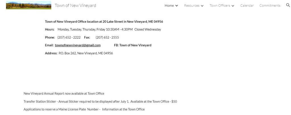 Home » Listings » TOWN OF NEW VINEYARD January 4, 2025 TOWN OF NEW VINEYARD Civic New Vineyard Annual Report now available at Town Office Add to favourites Report abuse Contact details Please complete the captcha field below to view phone number and/or email address. http://newvineyardme.org WHOIS Created on: 10/17/2016, 17:57PM Last Updated on: 10/23/2025, 16:36PM Expires on: 10/17/2026, 17:57PM Registrant: Organization: Town of New Vineyard State: ME Country: UNITED STATES Country Code: US Domain Name: newvineyardme.org Name Servers: Host Names: ns-cloud-d4.googledomains.com, ns-cloud-d1.googledomains.com, ns-cloud-d2.googledomains.com, ns-cloud-d3.googledomains.com Audit: Created on: 04/13/2026, 00:59AM Last Updated on: 04/13/2026, 00:59AM Registrar: Squarespace Domains II LLC Registrar IANAID: 895 WHOIS Server: whois.squarespace.domains Contact Email: abuse-complaints@squarespace.com