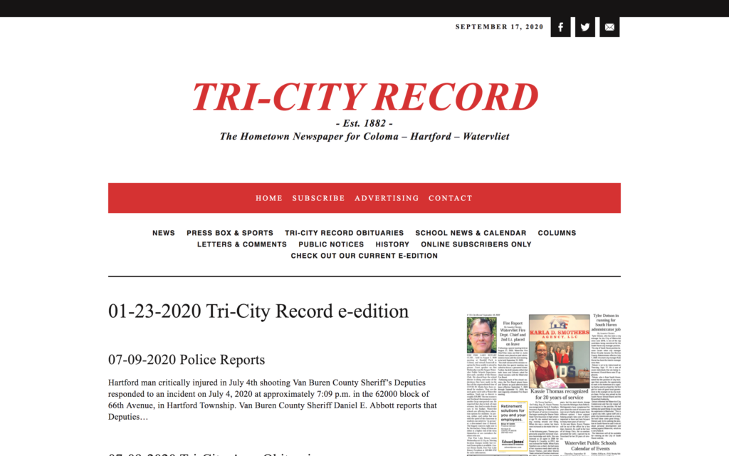Your weekly, local newspaper for Watervliet, Hartford, and Coloma, faithfully serving these communities since 1882. www.tricityrecord.com