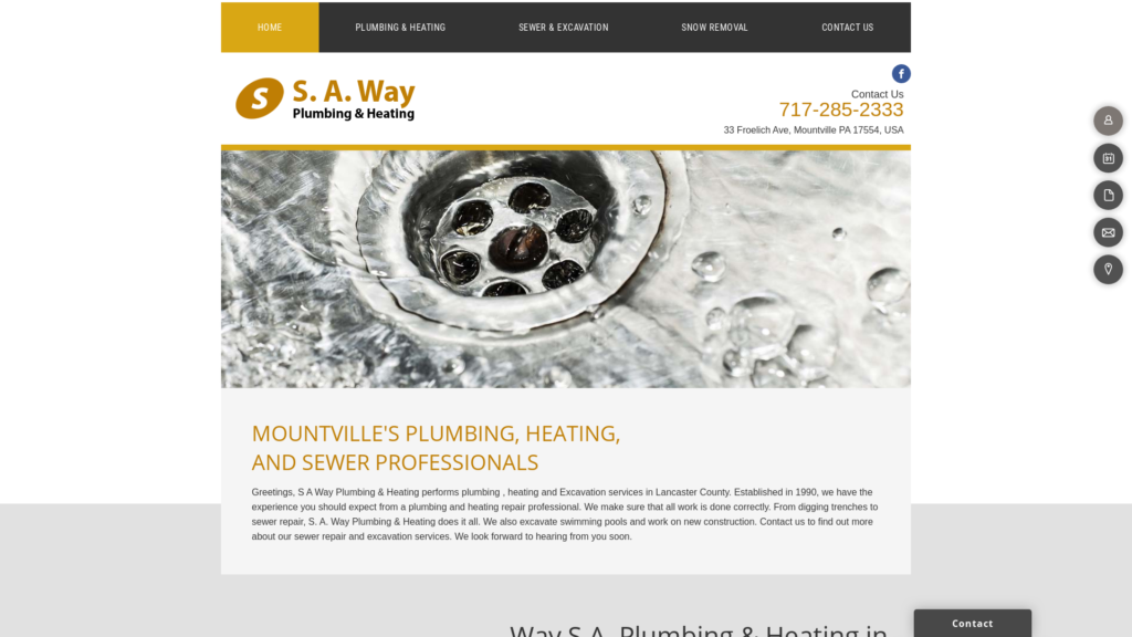 Greetings, S A Way Plumbing & Heating perform plumbing, heating, and Excavation services in Lancaster County. Established in 1990, we have the experience you should expect from a plumbing and heating repair professional. We make sure that all work is done correctly. From digging trenches to sewer repair, S. A. Way Plumbing & Heating does it all. We also excavate swimming pools and work on new construction. Contact us to find out more about our sewer repair and excavation services. We look forward to hearing from you soon.
