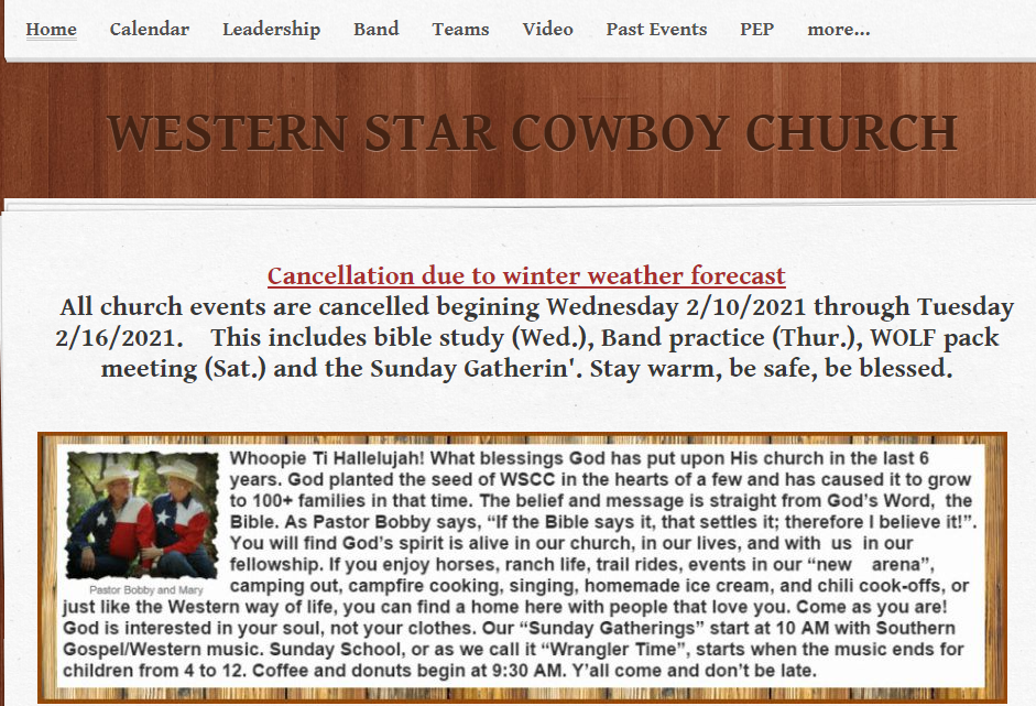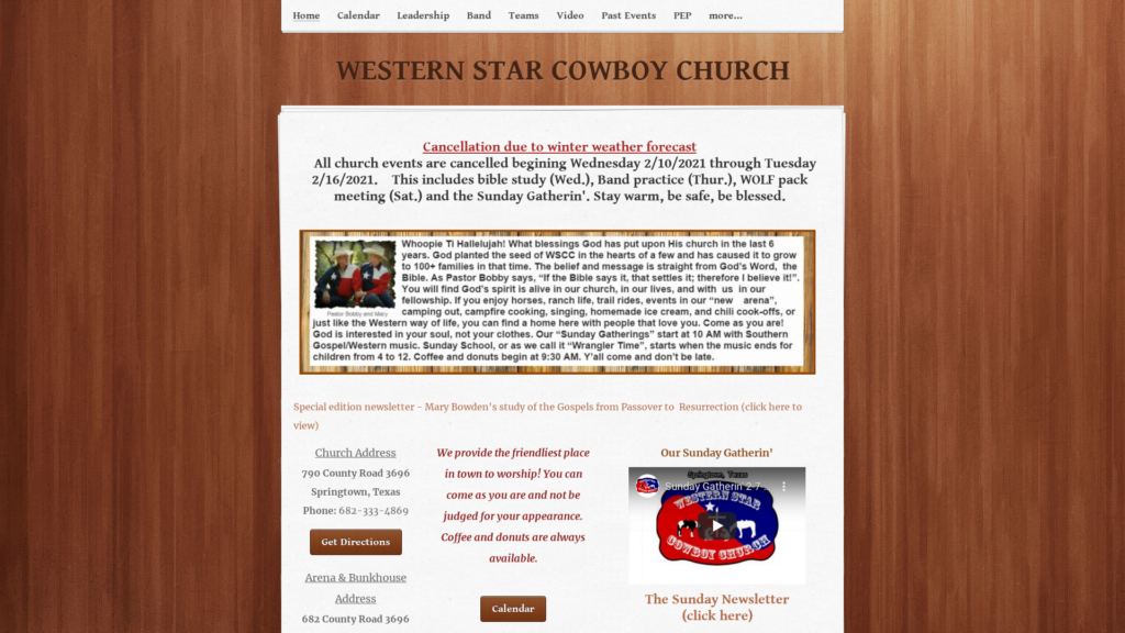 Bobby Bowden has been our Pastor since our conception. He has a Divinity degree but you would never know it by the way he speaks to you. His Texas draw and sincere words hit you right in your heart. His teaching and preaching are Bible based and interesting. His love for the Lord is quite passionate and it shows with his thoughtful insight into the scriptures. His favorite quote is: “If the Bible says it, that settles it; therefore I believe it!” That may follow with a holler of YEEEEHAAAA. You never know with him.