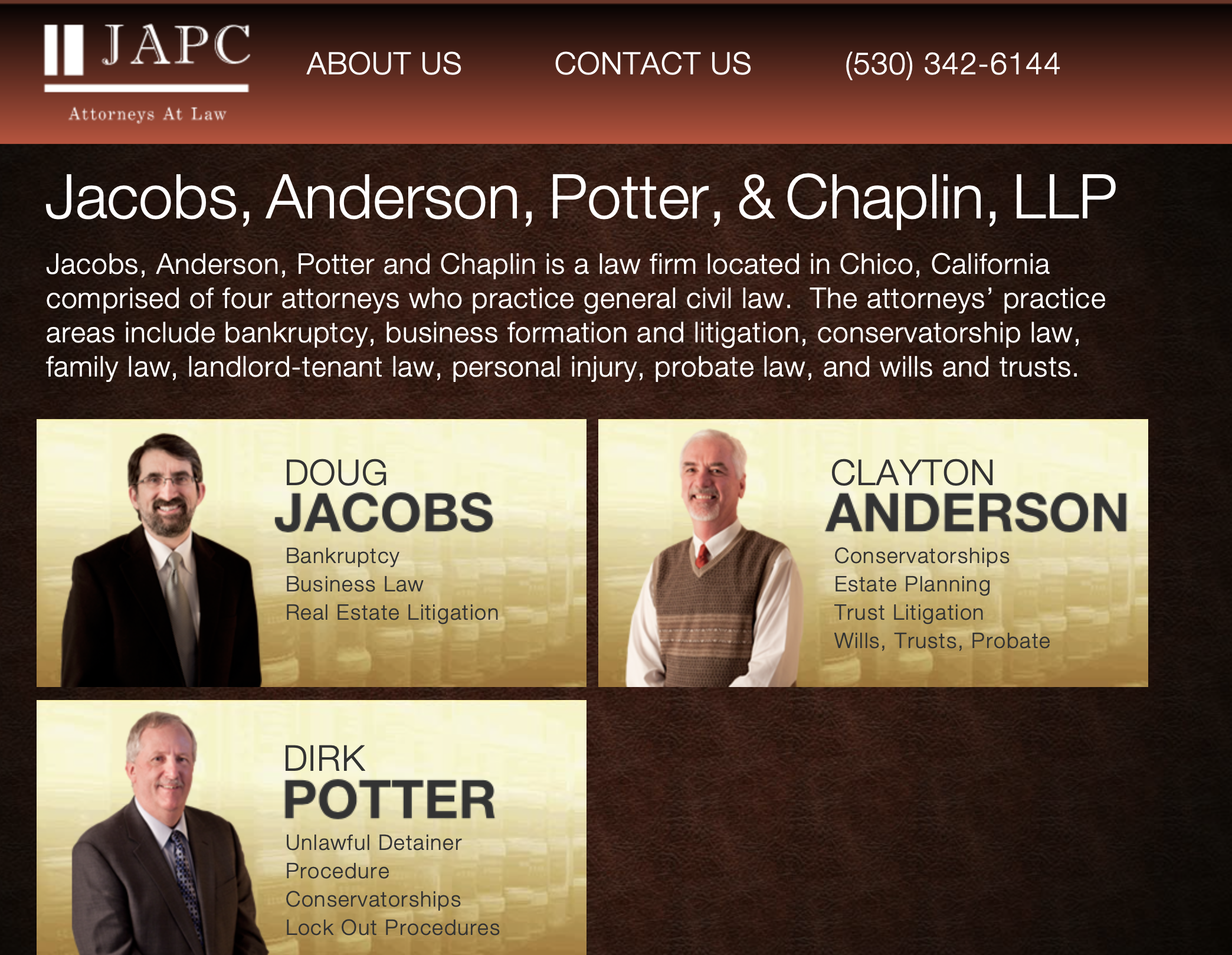 Jacobs, Anderson, Potter and Chaplin is a law firm located in Chico, California comprised of four attorneys who practice general civil law. The attorneys’ practice areas...